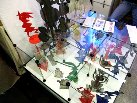 Glastisch mit Kleinskulpturen aus Stahl und Edelstahl