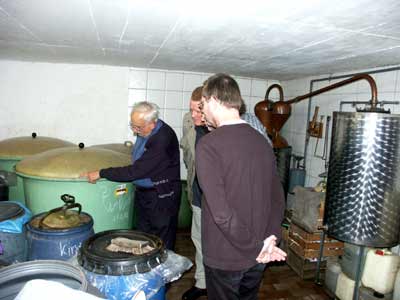 Nun wurde die Delegation in die Schnapsbrennerei geführt, wo die "Original-Fränkisch Schnäpse" gebrannt werden